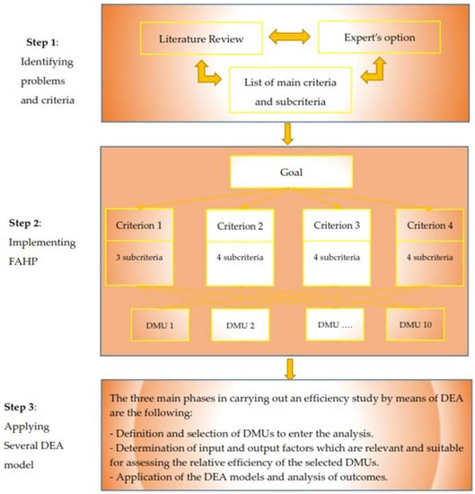 Habib and Sarkar [13] proposed an integrated location–allocation model for temporary disaster debris management under an uncertain environment. Stanković [14] used the FAHP model to select criteria and for the assessment of the impact of traffic accessibility on the development of suburbs. Hadi-Vencheh [15] proposed a hybrid model using FAHP–DEA for multiple criteria ABC inventory classification. Ulutas et al. [16] developed an integrated model including FAHP, Fuzzy Technique for Order of Preference by Similarity to Ideal Solution (TOPSIS), and AHP, axiomatic design (AD), and DEA for evaluating and selecting optimal suppliers. Gan et al. [17] used the triangular fuzzy number (TFN), AHP, and DEA approaches for analyzed economic feasibility. Rouyendegh et al. [18] combined a hybrid DEA–Analytic Network Process (ANP) for selecting the process within Iran Amirkabir University.