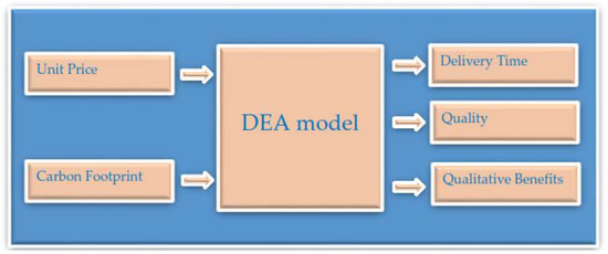Based on literature reviews and experts, five factors were considered in the DEA model, including unit price, carbon footprint, delivery time, quality of edible oil, and qualitative benefits factor. In summary, a graphic of the green DEA model for the analysis of potential suppliers along with two inputs and three outputs is shown in Figure 4.