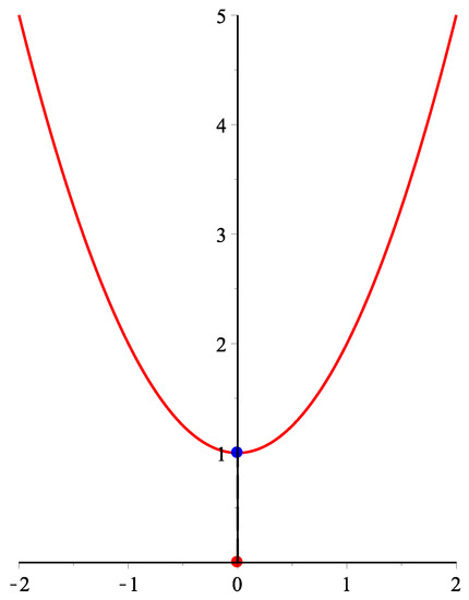 There are a parametric curve and a test point . The projection point and parametric value of the test point p are and , respectively. For point p and any initial value, the H-H-H method fails to converge to α. When the initial values are respectively, there repeatedly appear alternating oscillatory iteration values of 2.165320, 0.0778704, 6.505971, 9.609789. In addition, for a parametric curve , , for any test point p and any initial value, the H-H-H method fails to converge to α (see Figure 3).