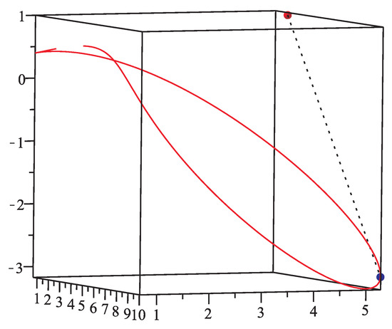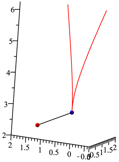 Because of a singular point on the parametric curve, we have also added some pre-processing steps before our method. (1) Find the singular point (0,0,3) and the corresponding parametric value 0 by using the methods [21,46,47,48]. (2) Using our method, the orthogonal projection points of test points (2,4,2) and (2,2,2) and their corresponding parameter values 0 and 0 are calculated, respectively. (3) From all candidate points(singular point and orthogonal projection point), corresponding point is selected so that the distance between the corresponding point and the test point is the minimum one. In Figure 6, the blue point denotes singular point (0,0,3), which is also the orthogonal projecting point of the test point (2,4,2). This is the same for the blue point in Figure 7.
