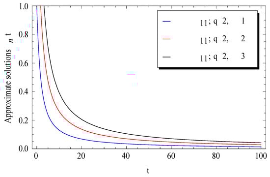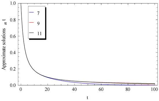 Usually, we begin by graphically demonstrating the convergence of the approximate solutions in Equation (19). In Figure 1, Figure 2 and Figure 3, the approximate solutions , , and were plotted at a fixed value of for different values of , where (Figure 1), (Figure 2), and (Figure 3). A rapid convergence was observed in these figures by using only a few terms of the approximate solutions. The main notice here is that the rate of convergence was increased for higher values of , where at the seven-term, nine-term, and eleven-term were nearly identical.