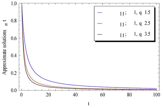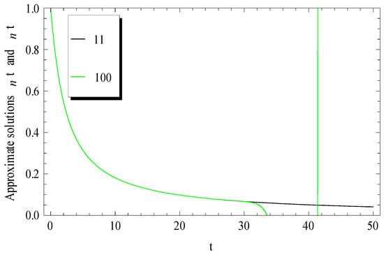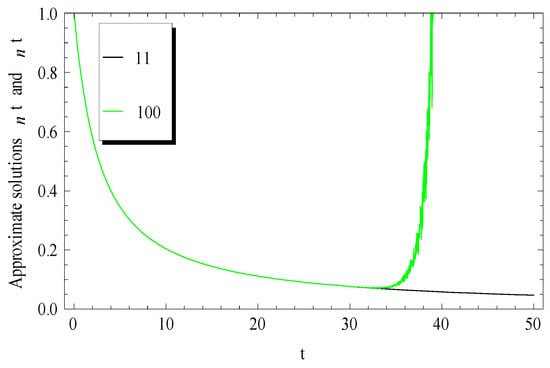 It can be easily checked that the -term approximate solution for Equation (19) satisfies the initial condition . At , Equation (19) becomes