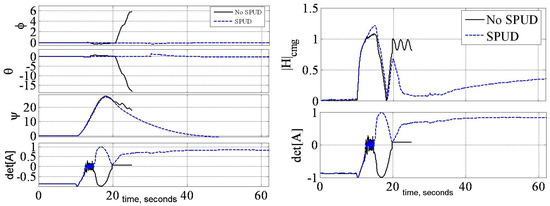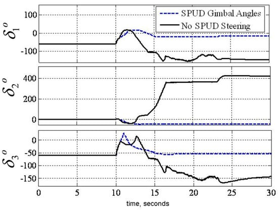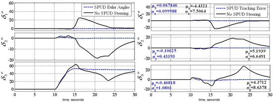 Direct comparisons are again used to reveal the efficacy of the methodology in Figure 6, Figure 7 and Figure 8 depicts. Despite success with decoupled control, the coupled matrix instantiation is used here to isolate that SPUD and SPUD-alone produces the results depicted even without decoupled control, thus SPUD is the most generically effective technique since it applies to other actuator geometries. The left plot in Figure 6 compares Euler angles when commanding a 50° yaw maneuver, while the right plot compares tracking errors for the same maneuver. The solid black line depicts what happened when the momentum trajectory struck a singularity … namely loss of attitude control, followed by eventual recovery after the trajectory was thrown clear of the singularity. The dashed blue line reveal a smooth, uneventful maneuver with smooth gimbal actions, despite penetrating and traversing a singularity.