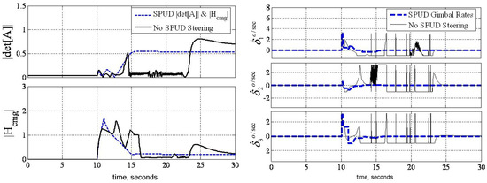 The true beauty of SPUD lies in its mathematical expression: where is a gimbal rate value immediately prior to the system becomes singular [44]. The relation’s physical interpretation is described by monitoring the condition of the [A] matrix of gimbal angles using typical methods of linear algebra (e.g., determinant, condition number (inverse) ratio of minimum and maximum singular values, etc.). As a singular condition is approached, the steering logic is engaged, holding the last valid, executable commanded gimbal rate penetrating the singularity and holding that value until the [A] matrix is no longer singular. The scheme has the added benefit traversing the singular condition at a maximal rate, since the singular actuator’s gimbal command is held at its maximal value, yet not permitted to go to infinity (caused by the presence of the zero in the denominator of that actuator’s steering command equation).