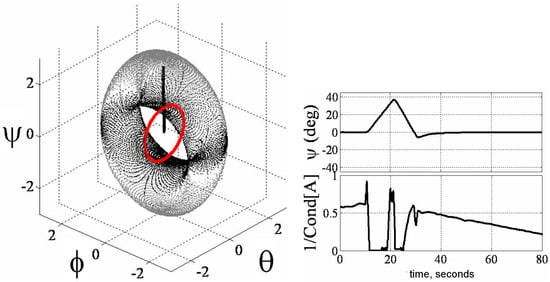 Figure 9 displays the experimental results validating decoupled control, where the geometry is the baseline (maximizes yaw momentum space). The left plot reveals penetration and safe traverse of the singularities, yielding the ability to perform a very large angle yaw maneuver displayed in the right plot. The commanded maneuver angle used in the prequel literature [26,40,41,42] was increased 700% from ±5° in 4 s to ±35° in 10 s to show-off the capabilities of decoupled steering. This new yaw maneuver commands significantly higher momentum change. Figure 9 reveals this new enhanced maneuver is achieved without incident despite clearly-evident singularity passage. Recall the coupled [A] matrix would have led to loss of attitude control had decoupled steering not been used.