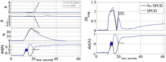 Potential hardware damage associated with loss of control authority when the singularity was encountered without SPUD caused that experiment to be prematurely terminated after about 25 s to prevent financial loss due to hardware damage, while the identical maneuver was performed with SPUD without incident. Roll, pitch, and yaw angles are displayed immediately above the invertibility of the matrix of gimbal angles clearly revealing no loss of control authority despite singularity penetration. This maneuver profiles commanded a thirty degree maneuver in merely eight seconds, immediately followed by a yaw reversal, and then regulation at zero. The maneuver did indeed encounter singularities as evidenced by the right plot of Figure 12 showing both the momentum magnitude and numerical assessment of the invertibility of the [A] matrix. This maneuver in particular was designed to just barely escape the singularity before re-traversing it again in the reverse direction to reveal the insensitivity of SPUD to such challenging trajectories. Smooth actuator gimbal with SPUD is revealed in Figure 13 compared to the loss of attitude control without SPUD.