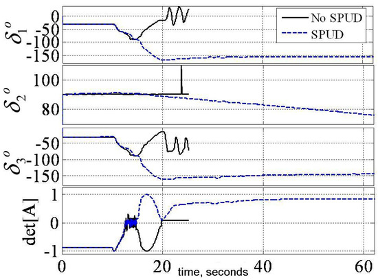 On the other hand, in the case of , only the second actuator is singular, yet using coupled steering commands would send singular (bad) commands to all three actuators. In instead, decoupled control equations are use, roll & yaw maneuvers could be accomplished without added pitch errors avoiding complete loss of 3-axis attitude control, as verified in simulations in Figure 5.