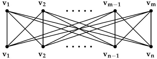 A graph is a complete bipartite graph if its vertex set can be partitioned into two subsets X and Y, such that one of the two endpoints of each edge in X and the other in Y, as well as each vertex , is adjacent to all vertices of Y, as is shown in Figure 4 below. Clearly, if and , then and . For more details, see [10].