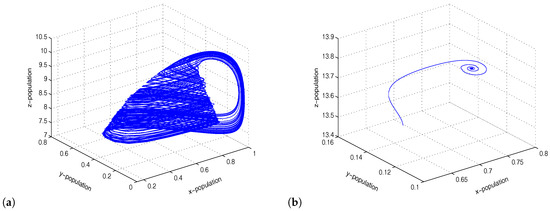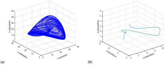 (a,b) Chaotic oscillations and stable focus of the system given by Equation (11) for and , respectively.