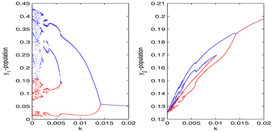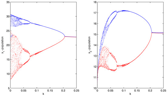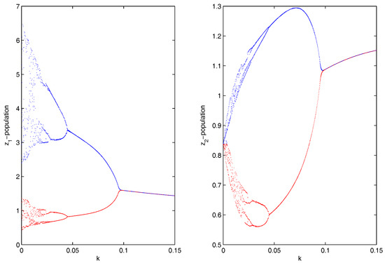 Bifurcation diagram for and populations of the coupled Priyadarshi–Gakkhar (PG)–PG system given by Equation (12) corresponding to the bifurcating parameter k, where .