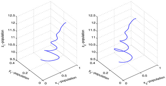 Now we describe the numerical simulations of the system given by Equation (8) and the coupled system given by Equation (9). The set of parameters were as follows: