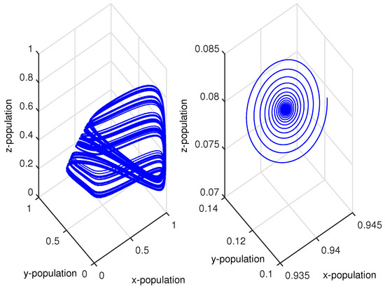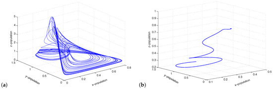 It is to be noted here that the system given by Equation (8) is not always dissipative, and the solutions may blow-up in finite time (explosive instability) depending on the parameter values and initial conditions [34]. In recent literature, few researchers have investigated different models that show finite-time blow-up in the solutions [34,35,36,37,38,39,40]. However, the above system given by Equation (8) shows very rich dynamics when . Upadhyay and Rai [7,33] explored chaotic dynamics in the system by increasing the intrinsic growth rate .