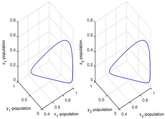 The figure shows stable dynamics of the coupled system given by Equation (12) for .