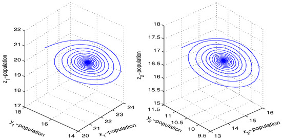 which were taken from [6]. Choosing , then the coupled system given by Equation (4) remained chaotic for any coupling strength (migration rate). We then chose two different values of and , and the HP model of Equation (3) showed chaotic dynamics and stable dynamics. For system 1, we set , so that the system showed chaotic dynamics, and for system 2, we set , so that the system showed stable dynamics (Figure 1). The initial condition for the simulation of the coupled system given by Equation (4) was . We could then investigate the effect of bi-directional migration between the two systems. For simplicity, we considered and drew the bifurcation diagram of the coupled system of Equation (4) with respect to the rate of migration k (Figure 2). It is to be noted that in the absence of migration (), system 1 showed chaotic dynamics and system 2 showed stable dynamics. When we introduced migration between these two systems, then the coupled system became stable through a Hopf bifurcation when the migration rate (k) crossed a threshold value, (Figure 2). We observed that a small migration destabilized the stable system, and the coupled system showed higher periodic and chaotic oscillations, but if the strength of migration was increased gradually, then the coupled system became stable. We also observed that for , the coupled system of Equation (4) had a unique positive interior equilibrium . We also obtained the RH determinants, , , , , , and , which satisfied the RH stability criterion of order 6. The eigenvalues of the coupled system given by Equation (4) were . Hence, the system given by Equation (4) was stable around the positive interior equilibrium (Figure 3).