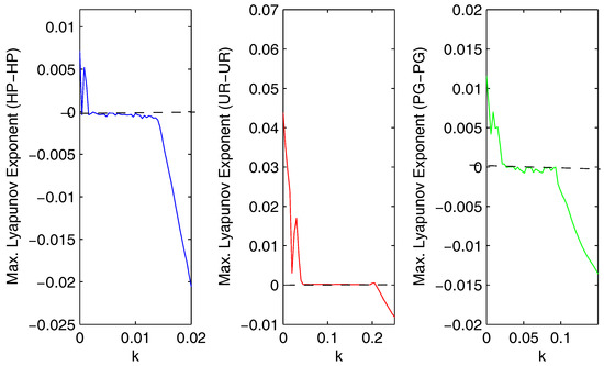 We calculated the maximum Lyapunov exponent (Figure 13) for the coupled systems given by Equations (4), (9) and (12) with respect to the coupling strength (k). We observed that if we increased the strength of migration, then the value of the maximum Lyapunov exponent became negative. The maximum Lyapunov exponent (Figure 13) confirmed that the coupled systems (HP–HP, UR–UR, and PG–PG) became stable from chaotic dynamics.