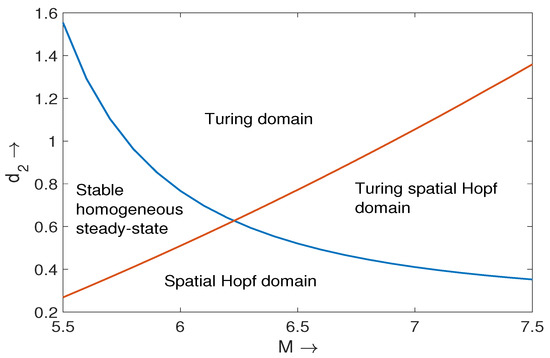 for all positive real k and M. The homogeneous steady-state loses its stability through the spatial Hopf bifurcation if , for some , and through the Turing bifurcation if , for some .