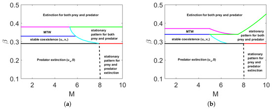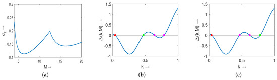 This equation can have more than one positive root. From now on, we assume that all parameter values are fixed except for M and . Suppose that for a chosen value of M, (27) admits a finite number of positive roots, . The corresponding values of in (26) are not necessarily positive. The Turing bifurcation threshold is given by the minimal positive value , and is the value of for which the minimum is reached.