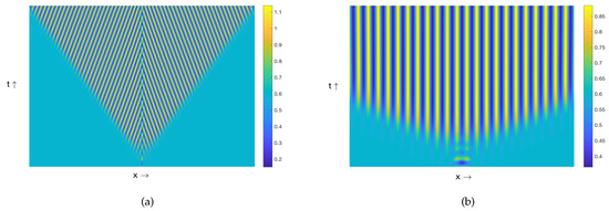 Finally, it is important to mention that the choice of parameters (24) leads to an interesting scenario for which the spatial Hopf and Turing bifurcation curves intersect. The two curves are shown in Figure 1 for , and they divide the parametric domain into four different regions. Spatial patterns produced by the prey population for parameter values taken from spatial Hopf domain and Turing domain are presented in Figure 3a,b. In order to emphasize the fact that the stationary Turing pattern can be obtained for equal diffusion coefficients, we set and observe a periodic in space and stationary in time solution (see Figure 3b). Various spatio-temporal patterns are observed for the values of parameters at the intersection of Turing and Hopf instability regions. Some of them are described in Section 3.