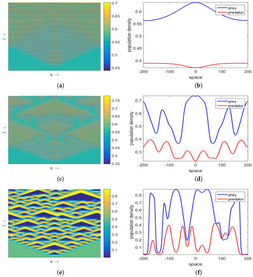 Spatiotemporal patterns (prey density) produced by the model (8)–(9) are presented in the left column for the parameter values as mentioned at the text and (a) ; (c) ; (e) . Corresponding distribution of prey and predator population over space at are presented in the right column, see (b), (d), (f).