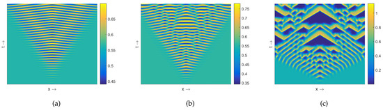 Solutions homogeneous in space and oscillatory in time are observed for but close to it. The spatiotemporal pattern presented in Figure 4a is almost homogeneous in space but oscillatory in time for the value of close to the temporal Hopf bifurcation threshold. For larger values of we find spatiotemporal patterns periodic both in space and time (Figure 4b) and symmetric around . This symmetry is maintained due to the choice of symmetric initial condition. With the increase of we observe various complex aperiodic spatiotemporal regimes (Figure 4c). They are characterized by specific triangular patterns resulting from the merging of two peaks in the population density moving towards each other.