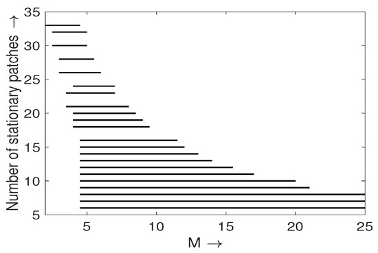 Another interesting aspect of the stationary patterns arising through the Turing bifurcation for the spatiotemporal model with nonlocal interaction term is the existence of multiple stationary solutions for a particular value of M. We have used forward and backward numerical continuation method to determine the range of M for the stationary patterns with different periodicity (Figure 7). Fixed parameter values are same as (1) except and . For example, stationary pattern with 33 patches (over a spatial domain of size ) exists for , with 32 patches for , and so on.