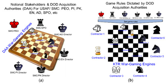 As mentioned above [2,6], we envision two categories of WGEs, namely, Government (or DAA) War-Gaming Engine (DAA-WGE) and Contractor-WGE (KTR-WGE). Figure 1 depicts our vision for the two categories of war-gaming applications [6]. DAA-WGE is to be played by DAA and its stakeholders (see Figure 1a). KTR-WGE is to be played DAA organizations posing as contractors, with game rules dictated by DAA and its stakeholders (see Figure 1b). The DAA-WGE and KTR-WGE mathematical models will be developed and integrated such that DAA and its stakeholders can use them to develop and generate optimum PTB solutions and associated acquisition strategy from both Government’s (DAA’s) and Contractor’s (KTR’s) perspective, respectively. The goal is to develop an optimum acquisition strategy that can address optimum contract type, associated incentives with optimum contract parameters and source selection criteria. To achieve this goal, we define and develop the following four types of game models: