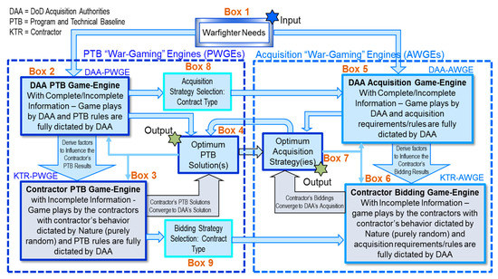 The UGAF framework [2,3,8] consists of two types of WGEs or game models, namely one representing the government’s acquisition perspective, and the other representing the contractor’s bidding perspective. The multivariate optimization involves the Defense Acquisition Authority- War-Gaming Engine (DAA-WGE) representing the government’s objective, and the KTR-WGE representing the contractor’s objective. Each WGE is further subdivided into PTB solution models and corresponding Acquisition (A)/Bidding (B) strategy models; government models are abbreviated as DAA-PWGE and DAA-AWGE; contractor models are KTR-PWGE and KTR-BWGE. KTE-BWGE is also referred to as KTR-AWGE because the results of the contractors’ bidding games will be used to formulate the government’s acquisition strategies. These proposed frameworks and associated game models address technical baseline, contract type, associated incentives, source selection criteria described in Sections M of a Request for Proposal (RFP) [9].
