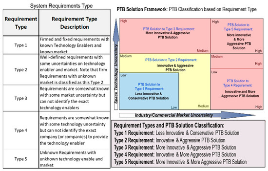 The TE’s uncertainties are expressed in terms of technology and market uncertainties. The definition for the system requirement types and associated PTB solution framework for classifying a PTB Solution are described in Figure 4 [6]. As an example, a Type 1 Requirement is mapped into a “Less Innovative and Conservative PTB Solution” where the “Market Uncertainty” and “Technology Uncertainty” are “Low” and “Low,” respectively. Since each “Requirement Type” is associated with specific measure of technology and market uncertainties, the proposed PTB solution framework allows us to select the appropriate acquisition strategy for each “Requirement Type” and assess the technology and cost risk for each “PTB Solution Type.”