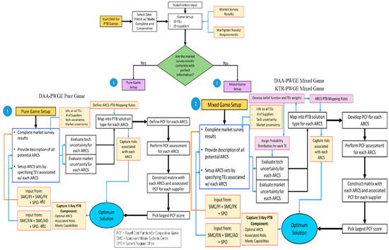 Like the DAA-PWGE game, the contractors will be simulated as players to play KTR-PWGE games to maximize their payoff or “Profit” for the selected optimum strategy resulting from optimally mapping an “ARCS” to a PTB Solution for a given set of belief function “.” The detailed KTR-PWGE mixed game algorithm is shown in Figure 6 with details provided in [6,7]. The PTB tracking tool described in [4,5] will be used to capture the PTB solution captured by the KTR-PWGE.