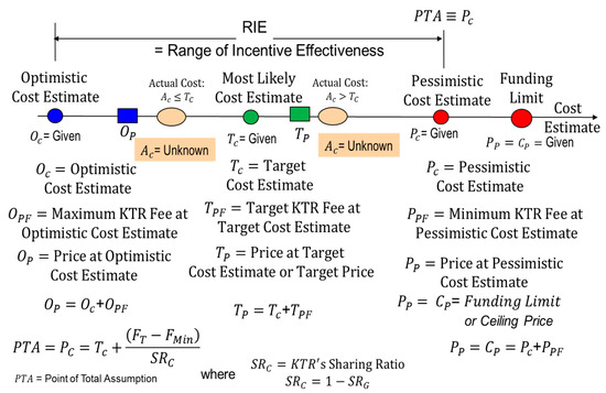 The CPIF KTR-AWGE game described in this section follows [4]. It assumes that the PTB solution obtained from the KTR-PWGE game model is “Type 3 Requirement” and the corresponding optimum “Contract Type” is CPIF. The objective of the KTR-AWGE model is to seek the optimum “bidding” target price and the associated contractor sharing ratios for maximum contractor profit, i.e., maximum benefit from the contractor perspective. Rewrite (Equation (50)) as a function of as follow: