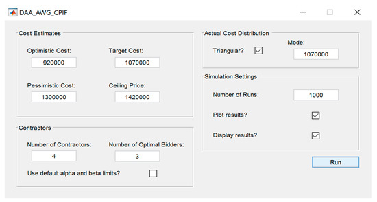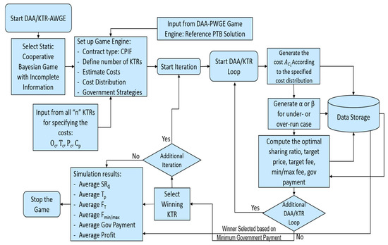 The parameter in Equation (62) will be selected to minimize the Government payment. The optimum target price depends on the maximum funding limit (), contractor sharing ratio, target cost and actual cost of the ith contractor. Figure 9 describes the DAA-AWGE-CPIF Monte Carlo simulation approach to determine the optimum target price, SRs and Government payment under Government’s perspective.