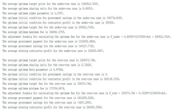 In summary, for contractor bidding games (KTR-AWGE), the contractor maximizes the profits with the expected contractor’s bidding parameters for contractor’s sharing ratio, , and optimum target price, , as follows, from Equations (81), (82), (86) and (87):
