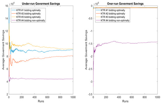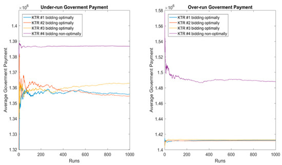 For DAA-AWGE, the DAA selects a winning contractor based on the government savings for each set of contract parameters and choosing the maximize of the government saving. To average out the randomness in the optimal solutions, the acquisition and bidding models were iterated several thousand times. The CPIF DAA-AWGE program outputs the average value for each optimal contract parameter, as well as average government payment, the fee adjustment formula, and average initial conditions and . This section presents simulation results of four contractors and three optimal bidders. Among the optimal bidders, the limits for the randomly generated control parameters and are adjusted to model different bidding behavior. In this simulation, our team treats the Contractor #1 as the “Average” bidder. The limits for Contractor #2 are changed so that this contractor tends to select unfavorable sharing ratios from the DAA perspective; hence, Contractor #2 is “Non-Cooperative.” On the other hand, Contractor #3 tends to select sharing ratios favorable to the DAA and is called the “Cooperative” bidder. The precise limits for these control parameters are depicted in Figure 10.