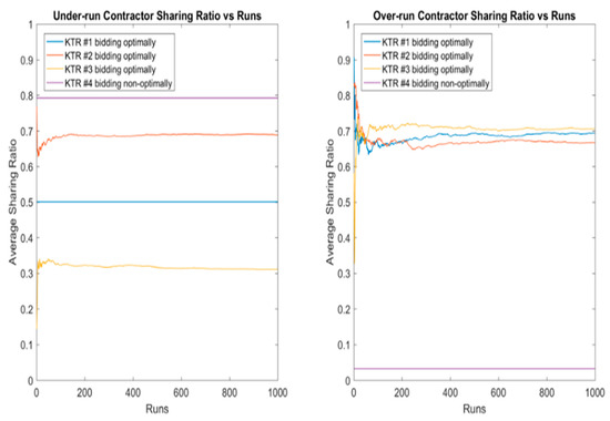 Substituting Equation (52) into Equation (49), and using the calculus of variation approach, the optimization problem can be solved by searching for the SRs that can maximize and then search for the optimum target price that can maximize . For both DAA and KTR games, we first maximize the cost function with respect to the contractor sharing ratio, by solving the following equation: