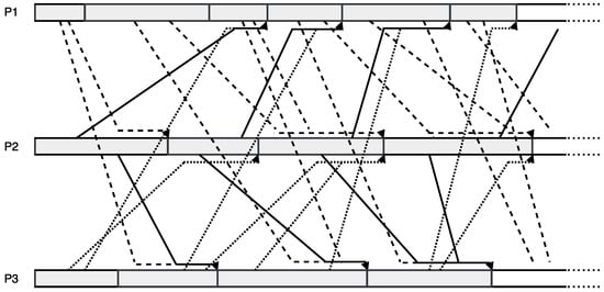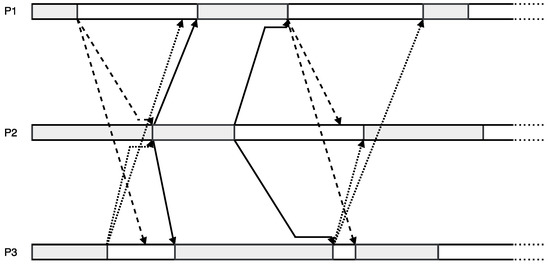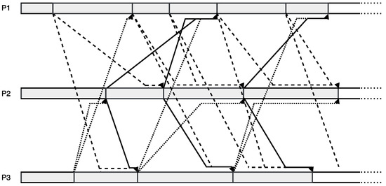 It is important to notice that asynchronous iterations perfectly work without the synchronization points, which may constitute a decisive bottleneck. In other words, we proceed the next iteration using the latest local data rather than waiting for the newest information from other processors. Finally, we are interested in the operational process of such iterations. A typical example is showed in Figure 1.