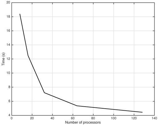 In this section, we are interested in the numerical performance of the asynchronous parareal method. We utilize Alinea [41] to carry out the mathematical operations, which is implemented in C++ for both central processing unit and graphic processing unit devices. Note that it has basic linear algebra operations [42] and plenty of linear system solvers [43,44,45], together with some energy consumption optimization [46] and spatial domain decomposition methods [47]. The parareal algorithm code is compiled with the “-O2” option in GCC 7.3.0 environment, which is a well-known compiler system produced by a free-software project. Besides, the experiments are executed on the SGI ICE X clusters connected with Fourteen Data Rate (FDR) InfiniBand network at 56 Gbit/s. Each node includes two Intel Xeon E5-2670 v3, 2.30 GHz, CPUs. Finally, SGI Message Passing Toolkit (MPT) 2.14 provides the MPI environment.