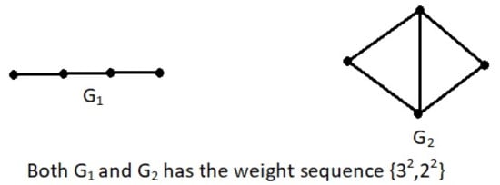 Consider the weight sequence W = {1,}. This is a gcws, since realizes it. We now show that this is the only graph realizing W. Let G be any graph realizing W. Let u be the vertex of G with weight 1. Let be the maximum clique size of G. Then, by Lemma 2, for every vertex v of G, . This holds for u also and hence . If is any edge of , then = 2, a contradiction. Thus, is an independent set. Since G is connected, u is adjacent to every vertex of G and hence G is . ☐