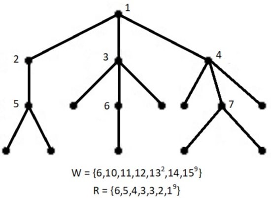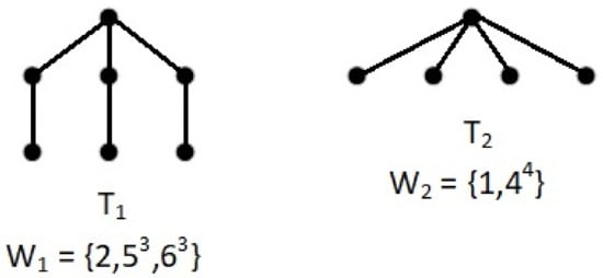 The proof for (1) follows from Proposition 2. (2) Let u be a vertex of T with weight . Let be the branches at u. Without loss of generality, assume that = and = . Consider the neighbourhood structure of T with respect to u. From Proposition 1, = = . We now show that is the second least weighted vertex of T. Let v () be any arbitrary vertex belong to . Then, v is a decendant of and from Proposition 1, = . Since is a proper subset of , = = . Let for any . As , = . This establishes that = and thus = n. ☐