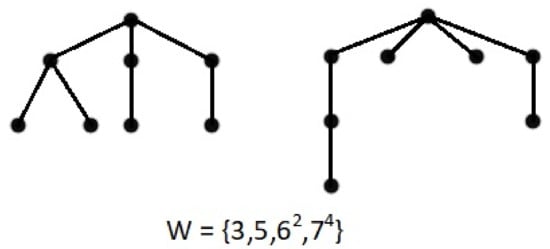 Let W = (3,3,3,4,4). Then, R = (2,2,1,1). Thus, = (2,2), = (1) partitions R, but there is no tree with gcwsW. The proof follows from Jordan’s theorem. Any tree has a maximum of two centroidal vertices; i.e., has a maximum of two vertices with least weight.