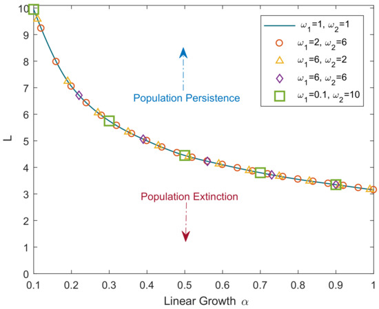 Critical domain size of the reaction–telegraph equation obtained numerically at various values of linear growth rate and various values of and as shown by different symbols and different colors. The solid blue curve corresponds to Equation (28). For parameters from below the curve, the population goes to extinction; for parameters from above the curve, the population exhibits unbounded growth.