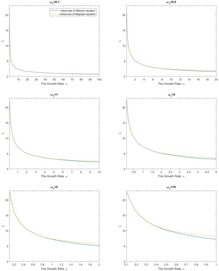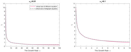 Interestingly, the expression of Equation (28) for the critical domain size for the population dynamics described by the reaction–telegraph equation coincides with the critical domain size obtained for the linear reaction–diffusion equation, e.g., see Section 3.1 in [24]. Note that the critical size does not depend on the choice of the initial conditions.