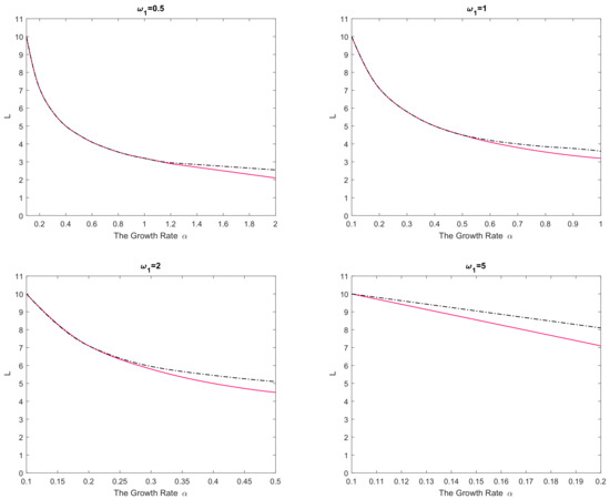 Dependence of the critical domain size on parameter a α in case the population growth is logistic (see Equation (30)). The dashed black curve shows the results obtained for the reaction–telegraph Equation (29), and the solid red curve shows the results obtained for the corresponding reaction–diffusion equation, i.e., Equation (29) with ω1 = 0. Other parameters are K = 1, D = 1.