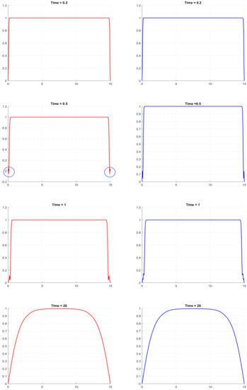 Solution of the reaction–telegraph equation with the logistic growth without cutoff (left, red curves) and with the cutoff of negative values (right, blue curves). Parameters are and . The circles mark the location of the areas where the solution becomes negative.