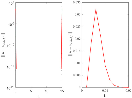 Distribution of the error over space at , i.e., immediately after the cutoff was implemented. (left) distribution over the whole domain ; (right) a magnified view of the part of the domain close to the left-hand side boundary.