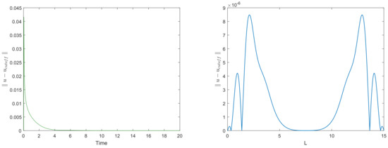 In order to make a more quantitative insight into the evolution of the perturbation introduced by the cutoff, we calculated the ‘error’—the difference between the solutions with and without cutoff—as a function of time and space. Figure 5 shows the distribution of error over the domain at time (i.e., immediately after the cutoff was done), as corresponds to the second row in Figure 4. The error is non-zero only in small areas close to the domain boundaries where the solution became negative. Figure 6 left shows how the maximum error over the domain (i.e., the maximum of functions shown in Figure 5) evolves with time. It is readily seen that the maximum error promptly decays with time, eventually reaching very small values. Figure 6 right shows the distribution of error over space at time , i.e., as corresponds to the bottom row in Figure 4.