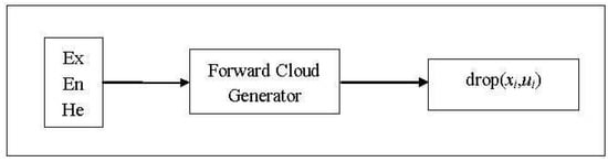 Given three digital characteristics , and , forward cloud generator in Equations (6)–(8) can produce N cloud droplets of the normal cloud model (Algorithm 2), which are two-dimensional points ().