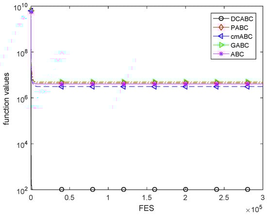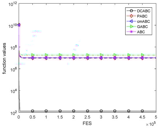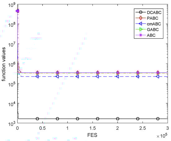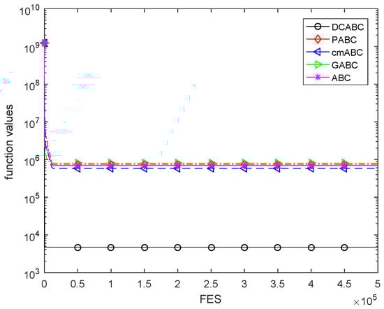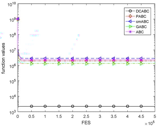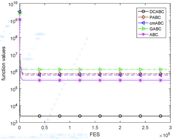 Unimodal function , hybrid function and composition functions are chosen to exhibit the convergence precision of all compared algorithms. Figure 3, Figure 4, Figure 5, Figure 6, Figure 7 and Figure 8 are the convergence graphs of five algorithms. The horizontal axis is the number of function evaluations (FES), and the vertical axis is the function values over one independent run. In all the figures, DCABC is represented by the black line with circles, and it has larger descend gradient and gets the minimal error values among the five algorithms. The convergence speed of DCABC is also obviously superior to the other four algorithms.