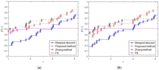 Figure 1a,b and Figure 2a,b show the performance profiles measured in accordance with CPU time, NI, Nf and Ng, respectively. From the viewpoint of CPU time and the number of iterations (NI), we observe in Figure 1 that the three-step discretization method is successful. The proposed method works better than the steepest descent method. Although the FR method is rapid and accurate, it has not led to descent direction in many cases. Therefore, the graph of FR method placed lower than the graph of the steepest descent method for .