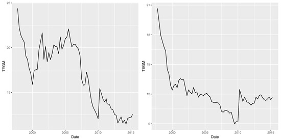 TEGM values are quarterly settled and published by the Bank of Italy (see https://www.bancaditalia.it) for different types of credit transactions. We refer to the TEGM values for a particular credit transaction, “one-fifth of salary transfer”, in the period from 1 July 1997 to 31 March 2015 (data are quarterly observed, so the number of observations is 72). Moreover, two amount classes are analyzed: