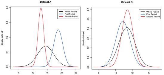 For Datasets A and B, the Chow test applied to the Euler discretization of Model (5) shows a structural break at time , corresponding to 1 January 2008 (p-value = 0.002726) for Dataset A and at time corresponding to 1 January 2009 (p-value = 0.006231) for Dataset B. In Table 2, the ML estimates for Datasets A and B are shown considering separately the series before and after these dates. Precisely, we consider for Dataset A the following sub-periods: